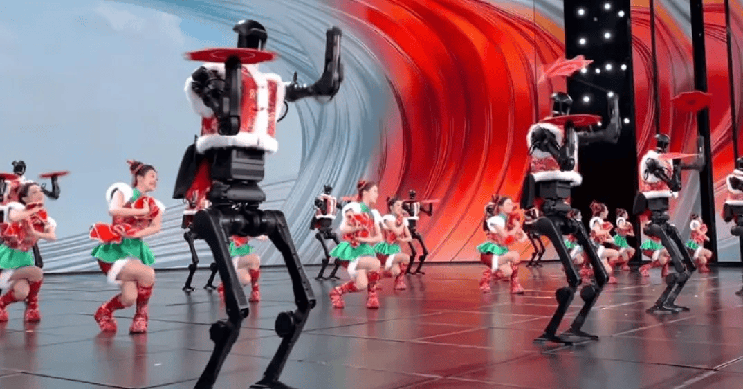 这一次,宇树完成了从“四脚”到“人形”的环节逾越。正在张艺谋执导的创意节目《秧BOT》中,16台宇树Unitree H1人形机械人以“福兮”为艺名,身穿大花袄、手持红手绢,取新疆艺术学院的舞者同台扭秧歌、转手绢。